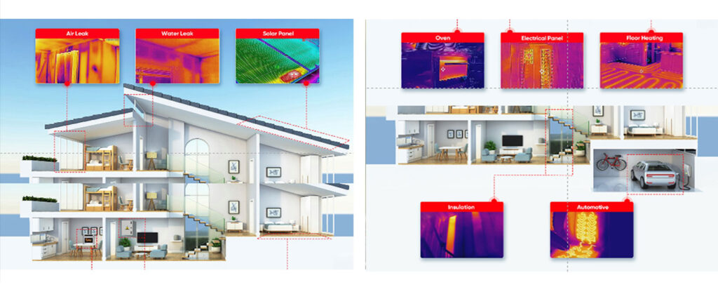 ในการตรวจสอบบ้านนั้นบริเวณที่ฉนวนกันความร้อนหายไปหรือชำรุด หรือมีการรั่วซึมของความชื้นภายอาคารมักจะตรวจพบได้ยาก ก่อนที่จะลุกลามจนเกิดความเสียหายต่ออาคารกล้องถ่ายภาพความร้อนจึงถูกนำมาใช้ในการค้นหาปัญหาเหล่านี้ เพื่อปรับปรุงประสิทธิภาพการใช้พลังงาน ลดค่าใช้จ่ายด้านพลังงาน และเพิ่มความสบายให้แก่ผู้พักอาศัย”