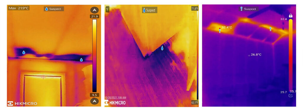 ระหว่างการตรวจสอบบ้านด้วยกล้องอินฟราเรด (IR Home Inspection) ระบบจะช่วยระบุ จุดบกพร่องของฉนวนได้อย่างรวดเร็ว (แสดงเป็นสัญญาณเตือนสี น้ำเงิน) และ พื้นที่ที่มีความชื้นผิดปกติ (แสดงเป็นสัญญาณเตือนสี เขียว)