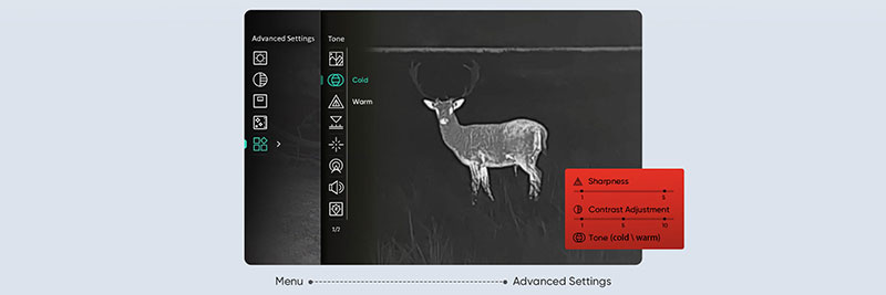 HIKMICRO CONDOR thermal monocular is characterized by the hierarchical menu, prioritizing frequently used functions according to user habits. Users can customize their visual experience to the highest level of comfort by adjusting settings such as contrast, sharpness, and other personalized options.